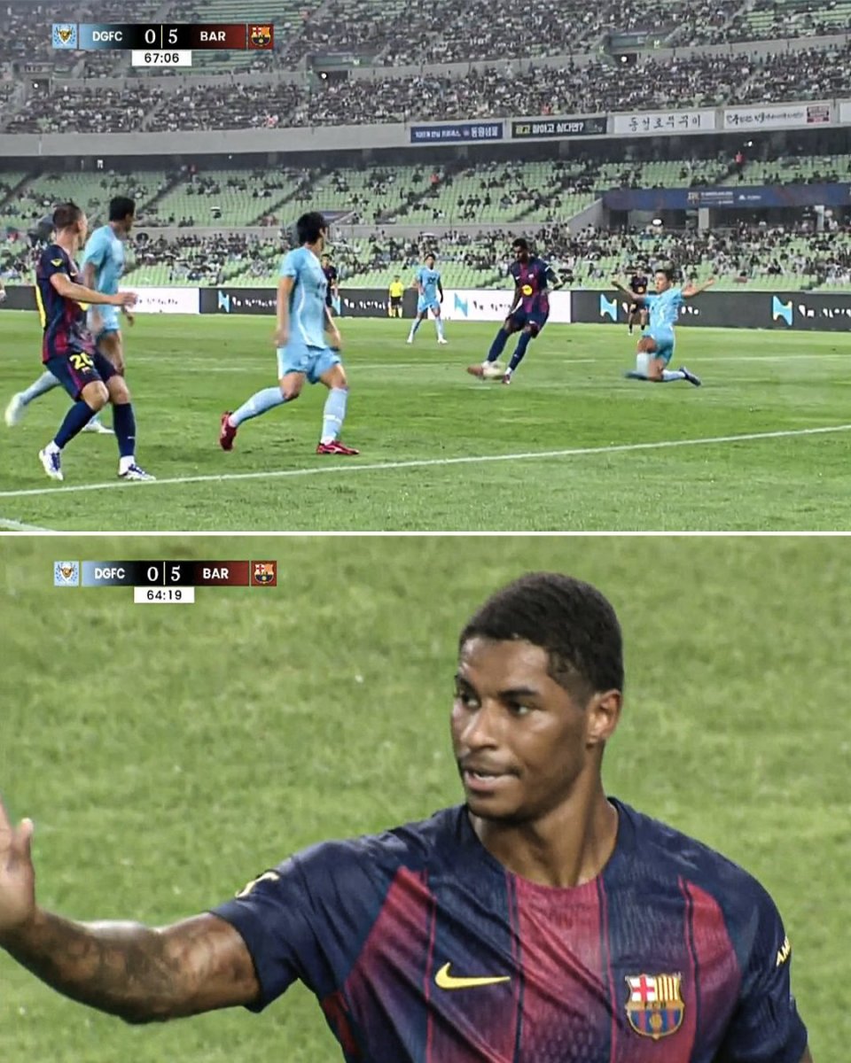 这个动作好像带来了好运,拉什福德在第65分钟接到埃里克·加西亚的传中球后冷静破门,打入在新球队的第一粒进球。自从由曼联加入巴萨后,拉师傅已经踢了3场比赛。他在巴萨与神户胜利船之战首秀,次战林加德的首尔完成助攻,现在则破门得分。