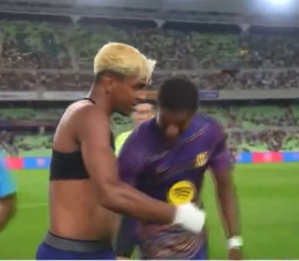 在出场比赛之前,27岁的英格兰边锋相当高兴,在场上与新队友亚马尔开了个玩笑。亚马尔是首发,半场休息时对手已经迫不及待与他交换球衣。拉什福德觉得很有趣,也想沾沾运气,他走到18岁的西班牙边锋面前,笑容灿烂地与之击掌,而且还拍了拍对方的「黄金左脚」,似乎在寻求祝福。